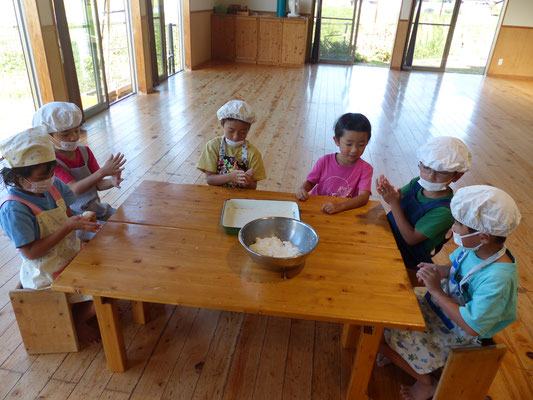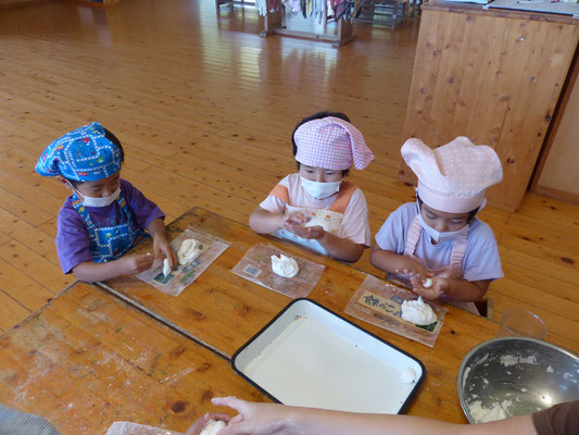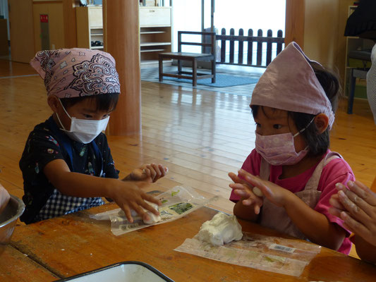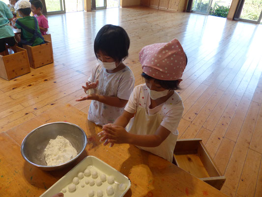 今日は、ぶどう・みかん・さくらんぼさんでお月見団子作りをしました!