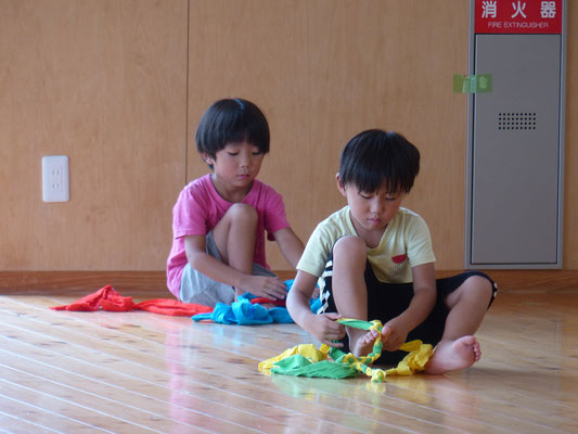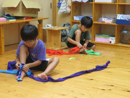 6色の布から、好きな色を2色選び、身長に合わせて布を切ってもらいました!